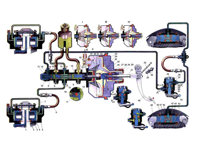 Когда система расторможена и педаль тормоза под действием пружины 32 оттягивается до упора в выключатель 34 стоп-сигнала, то вместе с пе- далью оттягивается толкатель 31 с поршнем 26 вакуумного усилителя. Корпус 20 клапана и шток 17 отжаты пружиной 19 в крайнее заднее положе- ние. При таком положении между головкой клапана 27 и седлом клапана образуется зазор, так как поршень отжимает клапан от седла. Вакуумная по- лость А через канал В, зазор между седлом и клапаном и далее через канал С сообщается с ат- мосферной полостью D. Поэтому при работающем двигателе разрежение из впускной трубы через клапан 18 передается в полость А и через каналы и зазоры в полость D. Поршни 11 и 15 главного цилиндра под действием возвратных пружин отжаты в заднее крайнее положение до упора в стопорные винты 8, отжимают уплотни- тельные кольца 9 от торца канавки поршня и через образовавшиеся за- зоры рабочие полости цилиндра сообщаются с бач- ком гидроцилиндра и трубопроводами высокого давления. Таким образом, в приводе тормозов давление отсутствует. Поэтому поршни 4 под действием упругой деформации уплотнительных ко- лец 3 отводятся внутрь цилиндров и не оказывают давления на тормозные колодки передних тормо- зов, которые будут находиться в легком сопри- косновении с поверхностью тормозного диска. При движении автомобиля без торможения, то есть когда в гидравлическом приводе нет давления, поршень 36 под действием пружины 40 и торсион- ного рычага 42 поднят вверх до упора в пробку 35. Поэтому полости корпуса, находящиеся над головкой поршня и под ней, свободно сообщаются. Это открывает свободный проход жидкости к ко- лесным цилиндрам задних тормозов. Но так как нет давления во всем приводе, тормозные колодки 43 отжаты от барабанов. При торможении, когда водитель нажимает на тормозную педаль, толка- тель 31 перемещает поршень 26. Вслед за поршнем перемещается под действием пружины 28 клапан 27 до упора в седло корпуса клапана. При перекры- тии седла полости А и D разобщаются. При даль- нейшем перемещении поршня 26 между ним и бурти- ком клапана 27 образуется зазор, через который полость D сообщается с атмосферой. Наружный воздух поступает в полость D через воздушный фильтр 30, через зазор между толкателем и кла- паном и далее через канал С. Атмосферный воздух создает давление на диафрагму 21. За счет раз- ности давления в полостях А и D, а также силы нажатия на педаль тормоза, корпус клапана пере- мещается вместе со штоком 17, который в свою очередь воздействует на поршень 15 главного ци- линдра. Сила, воздействующая на корпус клапана, зависит от степени разрежения во впускной трубе двигателя и от силы, прикладываемой к педали тормоза. При перемещении поршня 15 распорная втулка 13 отходит от стопорного винта 8 и уп- лотнительное кольцо 9 прижимается пружиной 12 к торцу канавки поршня. Таким образом, компенса- ционный зазор перекрывается и происходит разоб- щение полостей цилиндра и бачка. Поэтому при дальнейшем перемещении поршня 15 в рабочей по- лости привода передних тормозов создается дав- ление жидкости, которое через трубопроводы и шланги передается к колесным цилиндрам передних тормозов. Оно же воздействует и на плавающий поршень 11, который, перемещаясь, создает дав- ление в приводе задних тормозов. Под увеличива- ющим давлением жидкости в рабочих полостях пе- редние уплотни- тельные ко