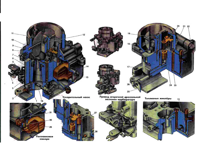 В крышке карбюратора крепится поплавковый механизм, который состоит из поплавка, подвешенного на оси, и клапана 30 подачи топлива. Поплавок карбюратора изготовлен из листовой латуни толщиной 0,2 мм. Клапан подачи топлива разборный, состоит из корпуса и запорной иглы. Диаметр седла клапана 2,2 мм. Конус иглы имеет специальную уплотнительную шайбу, изготовленную из состава на основе фтористой резины. Топливо, поступающее в поплавковую камеру, проходит через сетчатый фильтр 31. В корпусе смесительных камер расположены две дроссельные заслонки 16 первичной камеры и вторичной камеры, регулировочный винт 2 системы холостого хода, винт токсичности, каналы системы холостого хода, служащие для обеспечения согласованной работы системы холостого хода и главной дозирующей системы первичной камеры. отверстие 3 подвода разрежения к вакуумрегулятору опережения зажигания, а также переходная система вторичной камеры. Система холостого хода карбюратора состоит из топливного жиклера 13, воздушного жиклера и двух отверстий в первичной смесительной камере (верхнего и нижнего). Нижнее отверстие снабжено винтом 2 для регулирования состава горючей смеси. Топливный жиклер холостого хода расположен под уровнем топлива и включен после главного жиклера первичной камеры.