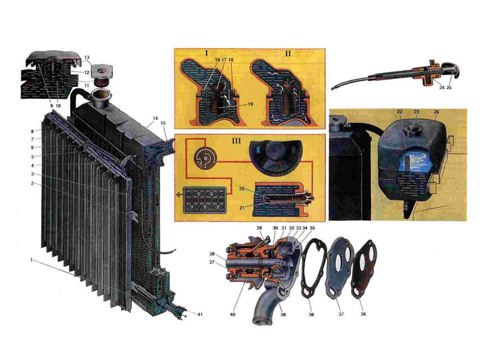 Система охлаждения служит для принуди- тельного отвода тепла от головки и цилиндров двигателя и передачи его в окружающую среду. Система охлаждения включает радиатор с жалю- зи. расширительный бачок, водяной насос, вентилятор, термостат и шланги. Система ох- лаждения герметичная, что обеспечивается пробкой радиатора, имеющей выпускной клапан, рассчитанный на избыточное давление 0.05 МПа (0,5 кгс/см''), что дает возможность экс- плуатировать двигатель на форсированных ре- жимах при температуре охлаждающей жидкости до 107 "С без ее вскипания, и впускной кла- пан для компенсации разрежения в радиаторе при охлаждении двигателя во время стоянки. Наливная горловина радиатора соединена пла- стмассовым шлангом с расширительным бачком, в котором содержится резерв охлаждающей жид- кости. При нагревании двигателя и увеличении объема жидкости она перетекает в бачок, а при охлаждении двигателя возвращается в ра- диатор. Этим обеспечивается постоянное мак- симальное заполнение системы охлаждения без воздушных пробок. Охлаждающая жидкость из радиатора насосом направляется в продольный канал, выполненный в блоке со стороны выпу- скного трубопровода, и через вертикальные отверстия в головке блока цилиндров поступа- ет в рубашку головки, омывая стенки камер сгорания, направляющие втулки и седла клапа- нов. Затем жидкость через рубашку впускной трубы, обогревая ее, попадает через термо- стат в верхний бачок радиатора. Циркуляция охлаждающей жидкости в рубашке блока цилинд- ров естественная (термосифонная) и проис- ходит вследствие вытеснения нагретой жидко- сти из рубашки блока более холодной, посту- пающей из водяной рубашки головки. Темпера- турный режим двигателя автоматически ре- гулируется термостатом, который обеспечивает ускоренный прогрев двигателя после пуска и поддерживает необходимую температуру двига- теля в процессе его работы. Помимо термоста- та, автоматически регулирующего температуру охлаждающей жидкости двигателя, на ав- томобиле предусмотрены жалюзи радиатора, управляемые вручную с места водителя и при- меняемые, в основном, в холодное время года. Температура охлаждающей жидкости в двигателе контролируется термоэлектрическим прибором, находящемся на панели приборов. Датчик при- бора установлен.во впускной трубе даигателя. Система охлаждения заполнимся на заводе нма- мерзаюшеи жидкостью антифризом ТОСОЛ А40 (раствор этилена ликоля с антивспенивающими коррозионными присадками в воде). При отсут- ствии жидкости ТОСОЛ А40 и необходимости эксплуатировать автомобиль зимой в систему охлаждения можно заправлять антифриз марки 40 (температура замерзания минус 40 "С) При пользовании антифризами надо соблюдать ос- торожность, так как они ядовиты при попада- нии в пищевой тракт организма. Кроме того, при попадании на окрашенную поверхность ку- зова, антифризы вызывают ее повреждение. Во- дяной насос 16 (см. рис. 18) центробежного типа, установлен на передней части блока двигателя Между корпусом 35 (рис. 20) насоса и стальной пластиной 37, а также между пла- стиной и блоком цилинд ров, установлены па- ронитовые прокладки 36 и 38. Насос вместе с пластиной крепится к блоку четырьмя болтами. Кроме того, пластина притягивается к блоку еще в одной точке с помощью болта и гайки. Этот болт служит одновременно для крепления установочной планки генера