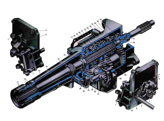 1.Рычаг осевого перемещения валика переключателя передач 2. Пробка маслоналивного отвер стия. 3 Боковая крышка картера. 4. Рычаг переключателя передач. 5. Кулак валика переключателя передач. 6. Замок кулака ва лика переключателя передач 7. Кронштейн валика переключателя передач. 8. Валик рычага включения заднего хода. 9. Рычаг включения заднего хода 10. Предохранительный упор. 11. Сальники удлинителя. 12. Подшипники скользящей вилки карданного вала. 13. вторичный вал. 14. Удлинитель картера из ведущая шестерня привода спидометра. 16. Втулка шестерни. 17 Ведомая шестерня первой передачи 18. Ступица синхронизатора. 19. Вил ка первой и второй передач. 20. Муфта синхронизатора. 21. Сухарь втулки шестерни. 22. Ведомая шестерня второй передачи 23. Ведомая шестерня третьей передачи. 24. Блокирующее кольцо синхронизатора. 25. Вилка третьей и четвертой передач. 26. Первичный вал. 27. Сухарь синхронизатора. 28. Пружинное кольцо сухаря. 29. Блок шестерен промежуточного вала. 30. Вилка шесгерни заднего хода. 31. Промежуточная шестерня заднего хода. 32. Картер коробки передач. 33. Стопор осей блока шестерен и шестерни заднего хода. 34. Ведущая шестерня первой передачи. 35. Задняя упорная шайба блока шестерен. 36. Шестерни угловой передачи привода спидометра. |