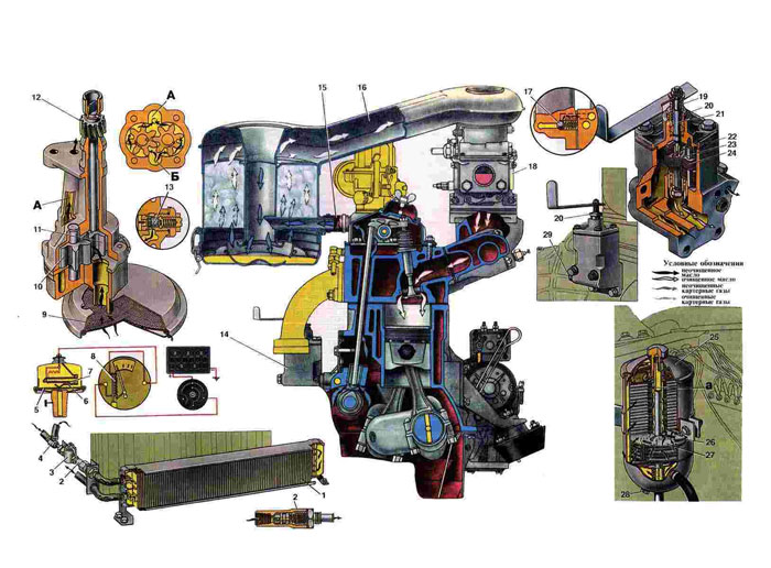 1. Масляный радиатор 2. Впускной клапан масляного радиаюра. 3. Запорный кран масляного радиаторе. 4. Тройник главной масляной магистрали. 5. Диафрагма датчика давления масла. 6. Упругая пластина. 7. Биметаллическая пластина датчика. 8. Биметаллическая пластина приемника 9. Фильтрующая сетка маслоприемника. 10. Ведомая шестерня масляного насоса 11. Ведущая шестерня масляного насоса. 12. Шестерня привода масляного насоса. 13. Предохранительный клапан масляного насоса. 14. Фильтр грубой очистки масла. 15. Шланг вентиляции масляного картера. 16. Воздухоочиститель. 17. Перепускной клапан фильтра грубой очистки. 18. Карбюратор. 19. Пружина. 20. Гайка сальника валика. 21. Валик поворота пластинчатого фильтрующего элемента. 22. Промежуточная пластина. 23. Фильтрующая пластина. 24. Очищающая пластина. 25. Фильтр тонкой очистки масла. 26. Картонная фильтрующая прокладка. 27. Картонная фильтрующая пластина. 28, 29. Пробки сливных отверстий. |