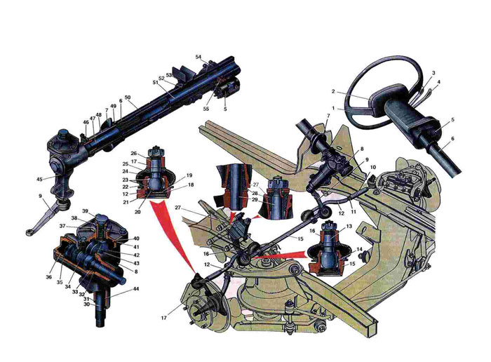 1. Рулевое колесо. 2. Крышка выключателя сигнала. 3, 4. Рычаги переключателя указателей поворота и света фар. 5. Выключатель зажигания. 6. Наружная труба колонки рулевого управления. 7. Манжета колонки. 8. Картер рулевого управления. 9. Рулевая сошка. 10. Регулировочная муфта. 1 1. Контргайка. 12. Боковая тяга рулевой трапеции. 13. Палец шарнира правой головки средней тяги. 14. Втулка. 15. Средняя тяга рулевой трапеции. 16. Маятниковый рычаг. 17. Поворотный рычаг. 18. Уплотнительное кольцо. 19. Пружина. 20. Нажимной вкладыш. 21. Стопорное кольцо. 22. Шплинт-проволока. 23. Опорные вкладыши. 24. Грязезашитный чехол. 25. Шайба чехла. 26. Палец шарниров левой головки средней и наконечников боковых тяг. 27. Кронштейн маятникового рычага. 28. Втулки. 29.Ось. 30. Вал сошки. 31, 32. Манжеты. 33, 35. Подшипники червяка. 34. Червяк. 36. Регулировочная пробка. 37. Стопорная гайка. 38. Регулировочная втулка. 39. Пообка. 40. Крышка картера. 41. Прокладка. 42. Ролик. 43. Ось ролика. 44. Втулка. 45. Стопорная гайка. 46. Хомут. 47. Нижняя часть рулевого вала. 48, 52. Внутренняя труба колонки рулевого управления. 49. Хомут манжеты. 50. Шлицевая втулка. 51. Верхняя часть рулевого вала. 53. Кронштейн крепления колонки. 54. Кронштейн выключателя зажигания. 55. Язык противоугонного устройства. |