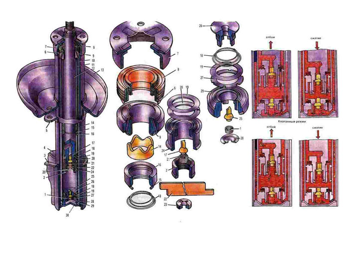 1. Пружина клапана сжатия. 2. Гайка поршня. 3. Скоба резервуара наружная 4. Скоба резервуара. 5. Усилитель чашки пружины. 6. Кольцо. 7. Гайка резервуара. 8. Манжета штока с пружинами. 9. Направляющая штока. 10. Резервуар. 11. Рабочий цилиндр. 12. Шток. 13. Чашка пружины нижняя. 14. Ограничитель хода отбоя. 15. Стопорное кольцо. 16. Опорная втулка ограничителя. 17. Клапан отбоя. 18. Пружина перепускного клапана. 19. Перепускной клапан. 20. Дроссельный диск клапана отбоя. 21. Пружина клапана отбоя. 22. Кольцо поршня. 23. Стопорная гайка. 24. Поршень. 25. Клапан сжатия. 26. Седло клапана сжатия. 27. Дроссельный диск клапана сжатия. 28. Чашка клапана сжатия. 29. Корпус клапана сжатия. 30. Дно резервуара. |