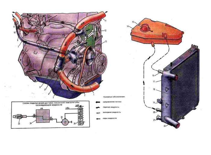 Система охлаждения двигателя - жидкостная (с принудительной циркуляцией жидкости), герметичная, с расширительным бачком. Систе- ма заполняется антифризом Тосол-A40. Эта жидкость голубого цвета без запаха и пред- ставляет собой этиленгликолевую смесь, не замерзающую при температуре окружающего воз- духа до минус 40 С. Жидкость обладает анти- коррозионными и антивспенивающимися свойст- вами, препятствует образованию накипи и по- этому рекомендуется для эксплуатации круглый год. Вместимость системы охлаждения на авто- мобиле мод. 2141-01 составляет 9,0 л. В сис- тему охлаждения входят: рубашки охлаждения, выполненные в литье и окружающие стенки ци- линдров в блоке, стенки камер сгорания и га- зовых каналов в головке цилиндров, радиатор 20 (рис. 11) с деталями его крепления, рас- ширительный бачок 21, электровентилятор 19 с кожухом, насос охлаждающей жидкости 24 с приводом клиновидным ремнем, рукава, шланги и воздуховоды, направляющие встречный поток воздуха от облицовки радиатора на радиатор и на двигатель. В систему охлаждения включен радиатор 18 отопителя салона кузова. Нор- мальный тепловой режим работы двигателя оп- ределяется температурой охлаждающей жидко- сти, которая составляет ВО... IOO'C. Указа- тель температуры жидкости расположен на па- нели приборов салона кузова, а датчик указа- теля температуры 15 в головке цилиндров с левой стороны. Радиатор. На автомобиле уста- навливается трубчато- ленточный медно- латунный радиатор 18 (рис. 10) с пла- стмассовыми бачками. Латунные трубки в осто- ве радиатора располагаются горизонтально в два ряда. Правый бачок радиатора разделен внутри на две равные части. В верхнюю часть через патрубок подается горячая жидкость из двигателя, которая проходит через верхнюю половину трубок остова радиатора, затем че- рез левый бачок поток жидкости направляется в нижние трубки остова и далее через нижнюю половину правого бачка, патрубок и рукава подводится к термостату 5. В правом бачке радиатора расположены подводной 17 и отвод- ной 22 патрубки, патрубки 16 и 20, соединяю- щие радиатор с расширительным бачком 14, сливная пробка 21 и датчик 19 включения электровентилятора. Радиатор крепится в че- тырех точках на кронштейнах с помощью рези- новых амортизаторов (втулок), распорных вту- лок, болтов и гаек с шайбами. Расширительный бачок 14 служит для компенсации изменяющего- ся объема охлаждающей жидкости в зависимости от ее температуры. Бачок изготовляется из полупрозрачной пластмассы. Он крепится к ле- вому брызговику кузова. Нижний патрубок рас- ширительного бачка соединяется шлангом с патрубком 20 бачка радиатора. Верхний патру- бок расширительного бачке соединяется шлан- гом с верхним патрубком 16 бачка радиатора для отвода паров воды и воздуха. На расшири- тельном бачке расположена наливная горлови- на, которая герметично закрывается пластмас- совой пробкой 15 с расположенными внутри ее двумя клапанами (впускным и выпускным), соб- ранными в отдельном неразборном узле. Выпу- скной клапан открывается при давлении НО кПа (1,1 кто/см*). Этим обеспечивается повышение температуры начала закипания жидкости и пре- дупреждается интенсивное парообразование. При охлаждении жидкости ее объем уменьшается и в система создается разрежение. Впускной клапан в пробке открывается при разрежении в системе 3...13 кПа (0.03...0.13 кг/см) и пропускает возд