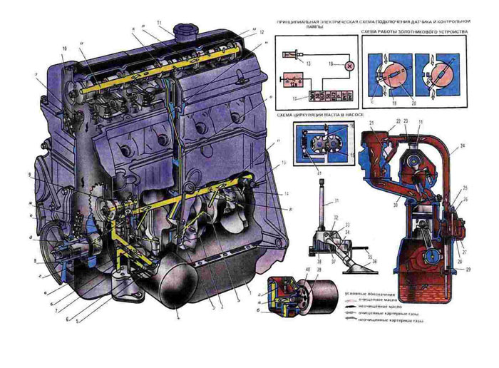 Смазочная система двигателя предназначена для снижения трения в различных узлах и ме- ханизмах двигателя, уменьшения износов тру- щихся деталей, охлаждения деталей и выноса продуктов износа с их трущихся поверхностей. Кроме того, она предохраняет детали от кор- розии, уплотняет зазоры, где это необходимо, и снижает общую шумность работы двигателя. Для смазывания двигателей применяются масла минерального происхождения. Наиболее важными свойствами масел, применяемых для двигате- лей, являются маслянистость, вязкость, чис- тота (отсутствие механических примесей и ки- слот). Маслянистость определяет способность масла надежно обволакивать трущиеся детали хорошо удерживающейся масляной пленкой, улучшающей условия работы деталей. Вязкость определяет густоту масла и его текучесть при определенной температуре и способность про- никать в зазоры трущихся деталей. Для повы- шения качества масел и ним добавляют специ- альные присадки, содержащие различные веще- ства, которые повышают смазывающую способ- ность масла маслянистость, делают более ста- бильной его вязкость при колебаниях темпера- туры, понижают температуру застывания и уменьшают окисление масла. Присадки способ- ствуют также вымыванию смолистых отложений, которые образуются в результате воздействия на масло высокой температуры и его окисле- ния. В зависимости от времени года и клима- тических условий для смазывания двигателя следует применять масла различной вязкости. Зимой вязкость масла должна быть меньше, так как масло с большей вязкостью при низкой температуре густеет и в холодном двигателе плохо проникает в зазоры трущихся пар, а также затрудняет заливку масла и пуск холод- ного двигателя. Летом вязкость масла должна быть больше, так как масло с малой вязкостью при повышенной температуре становится еще более жидким и легко выдавливается из зазо- ров и стекает с деталей, не обеспечивая нор- мального смазывания трущихся деталей двига- теля. Смазочная система комбинированная, при которой наиболее нагруженные детали смазыва- ются под давлением, а остальные - или на- правленным разбрызгиванием. или разбрызгива- нием масла, вытекающего из зазоров между со- прягаемыми деталями. Под давлением смазыва- ются коренные и шатунные подшипники коленча- того вала, опоры и кулачки распределительно- го вала, подшипники вала привода вспомо- гательных агрегатов и втулка зубчатого коле- са привода масляного насоса и распределителя зажигания. Разбрызгиванием смазываются стен- ки цилиндров, поршни с поршневыми кольцами, поршневые пальцы в бобышках поршня, цепь привода распределительного вала, устройство для натяжения цепи, опоры рычагов привода клапанов в направляющих втулках. Минимальное давление масла при частоте вращения ко- ленчатого *вала 850... 900 мин-* составляет не менее 50 кПа. (0,5 кгс/см''). а при час- тоте вращения 5600 мин-' - 350... 450 кПа (3,5... 4,5 кгс/см''). Заправочный объем смазочной системы составляет 4,2 л. Смазоч- ная система включает масляный картер 1. ука- затель уровня масла 3, масляный насос 7. маслоприемник с фильтрующей сеткой 36. пол- нопоточный масляный фильтр 4, редукционный клапан 41, датчик 13 контрольной лампы 18 недостаточного давления масла в системе и каналы подвода масла. Циркуляция масла в смазочной системе обеспечивается масляным насосом, который приводится в действие о